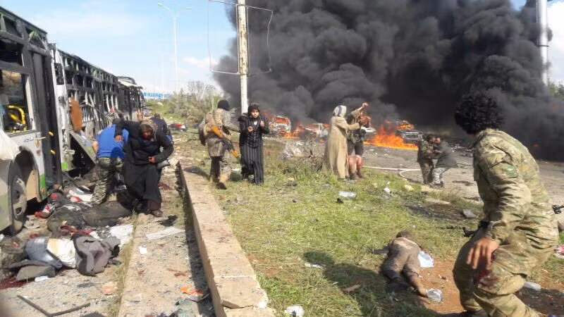 Tay súng khủng bố sử dụng một xe đánh bom tự sát (SVBIED) lao thẳng vào 5 xe buýt chở dân thường trong khu vực quận Al-Rashideen phía tây bắc thành phố Aleppo.