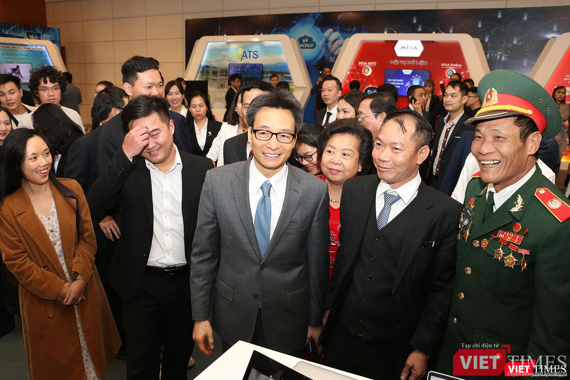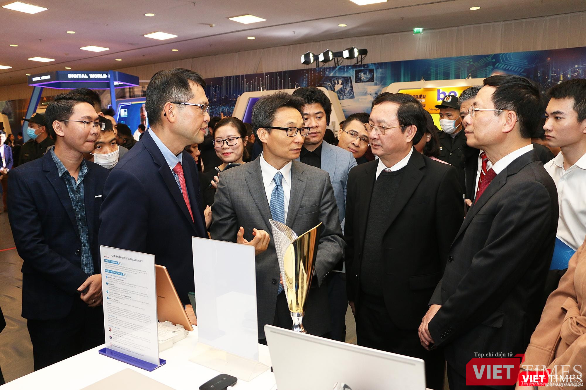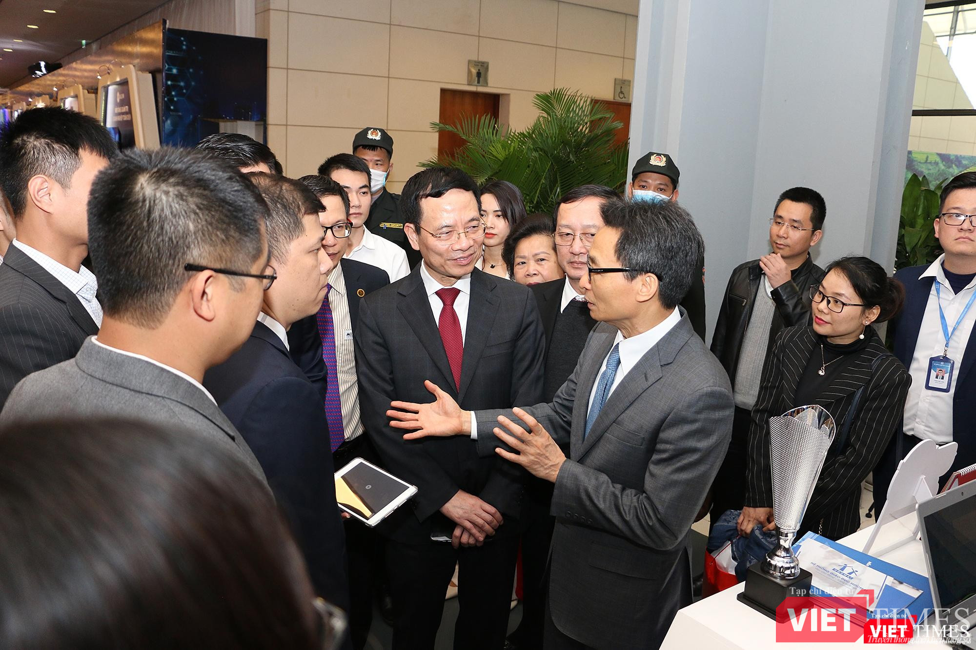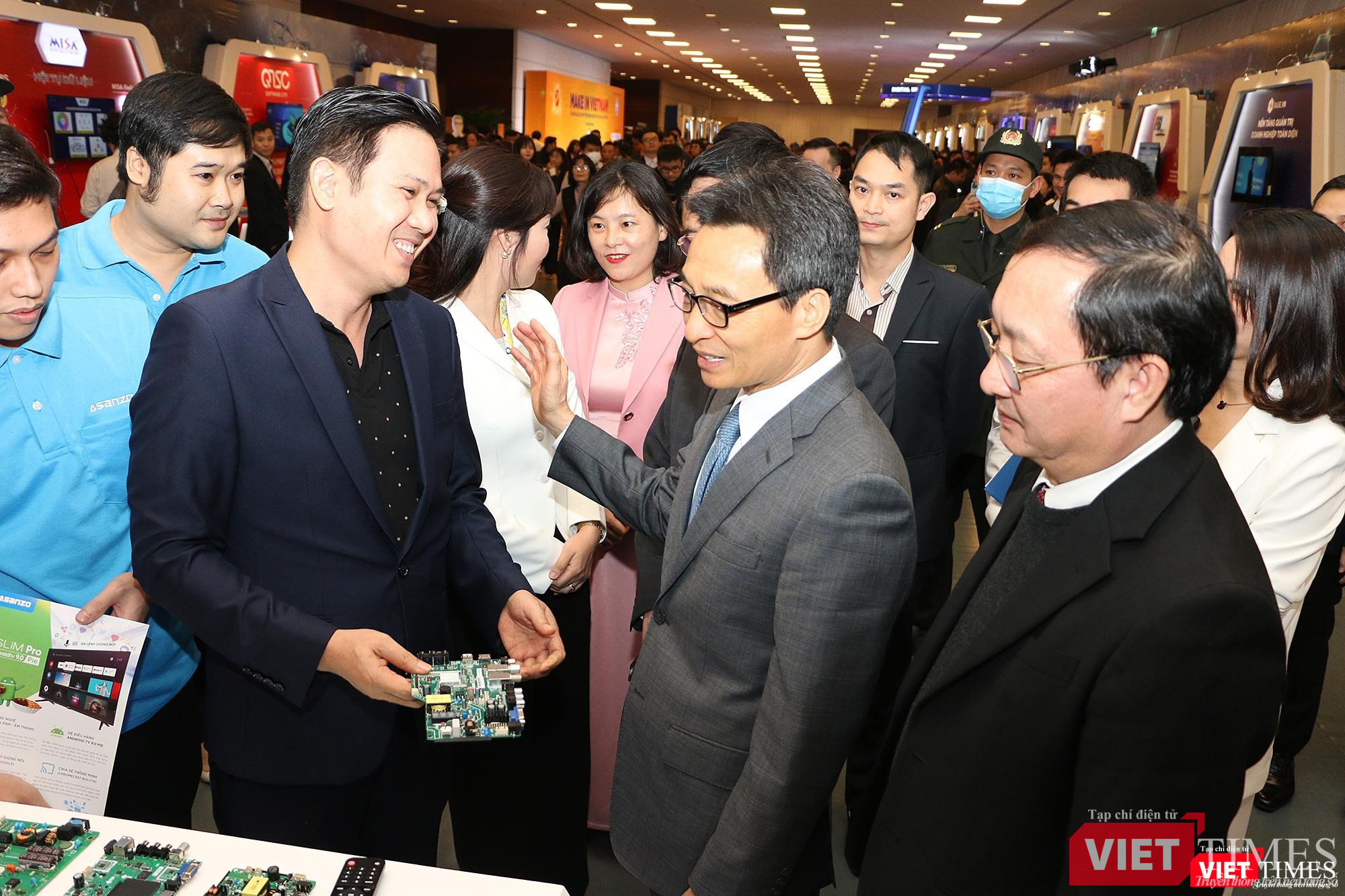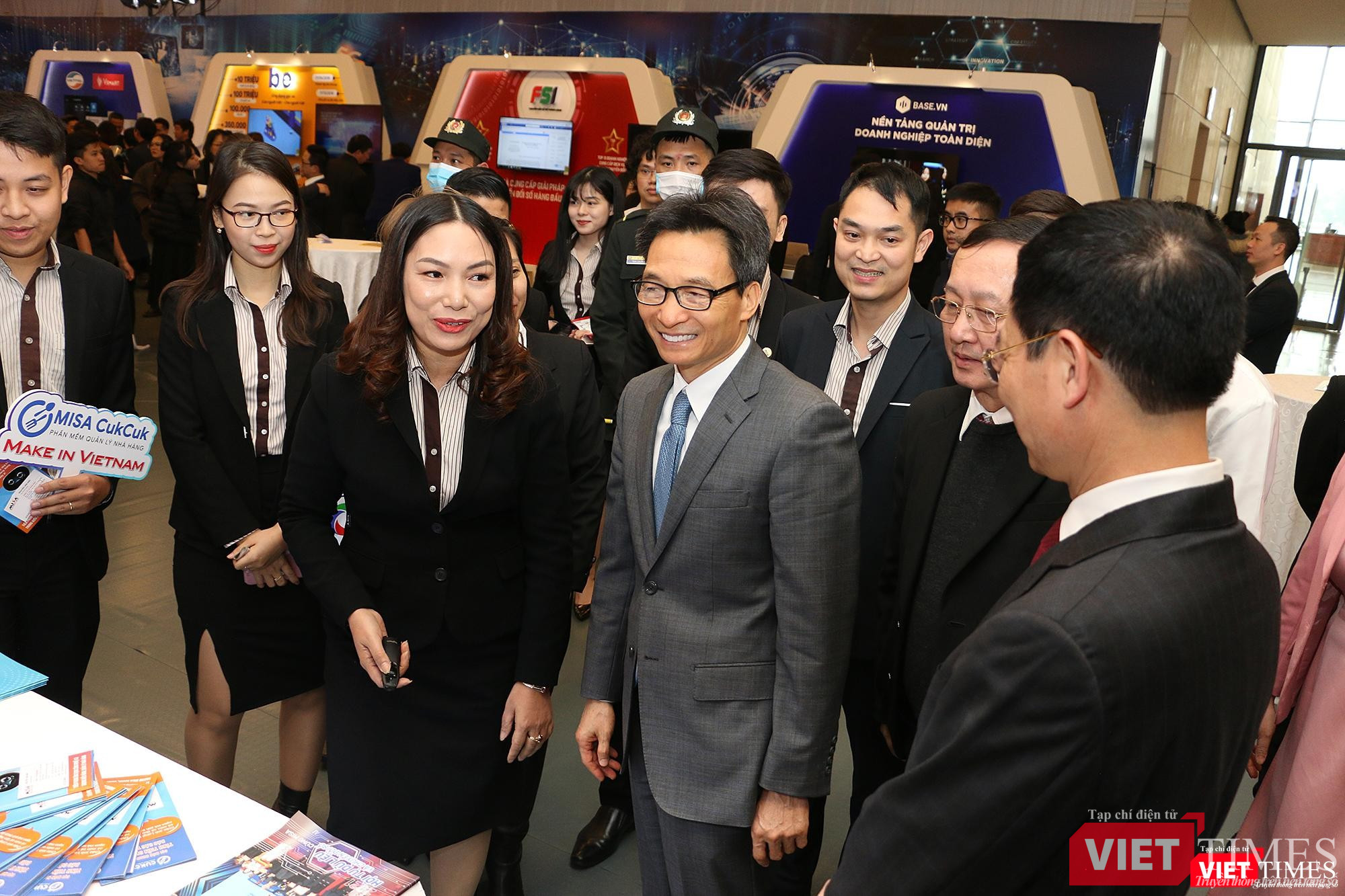 Phó Thủ tướng Vũ Đức Đam thăm các gian hàng giới thiệu sản phẩm của các công ty công nghệ tại Diễn đàn Quốc gia phát triển Doanh nghiệp Công nghệ số Việt Nam (ảnh: Đăng Khoa)
