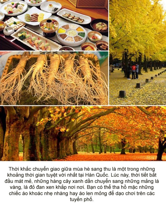 Mùa thu là mùa đẹp nhất trong năm ở Hàn Quốc, khi trên phố đâu đâu bạn cũng có thể nhìn thấy lá đỏ, lá vàng, và thời tiết lại vô cùng dễ chịu. Nếu bạn muốn đến Hàn Quốc, thì đây là thời điểm thích hợp nhất để lên đường!