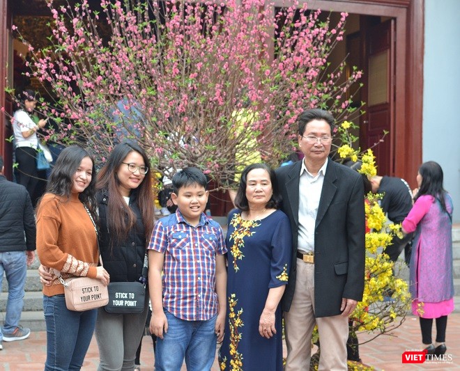 Một gia đình chụp ảnh lưu niệm bên cây mai của Đền Kim Ngưu, thuộc quần thể Phủ Tây Hồ
