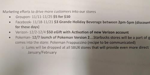 Theo BRG, hôm 17/11, một người tự xưng là nhân viên Starbucks đã chia sẻ trên mạng xã hội Reddit cái ông gọi là bản ghi nhớ nội bộ từ công ty, tiết lộ chiến dịch tiếp thị mới có liên quan tới việc phát hành sản phẩm mang tên "Pokeman Version 2".