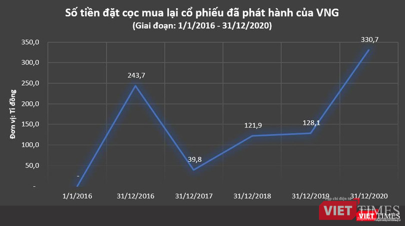 Theo tìm hiểu của VietTimes, từ cuối năm 2016, VNG bắt đầu ghi nhận các khoản đặt cọc mua lại cổ phần, với số dư tại thời điểm ngày 31/12/2016 là 243,7 tỉ đồng (đầu năm 2016 không ghi nhận khoản mục này). Số dư khoản mục này chạm đáy tại ngày 31/12/2017, sau khi VNG mua vào thành công 1.060.846 cổ phiếu quỹ, rồi tăng dần trở lại từ đó tới nay. Cũng trong khoảng thời gian này, công ty mẹ VNG không mua thêm cổ phiếu quỹ mà chỉ thực hiện bán ra 355.820 cổ phần cho Seletar Investment Pte Ltd vào tháng 3/2019.