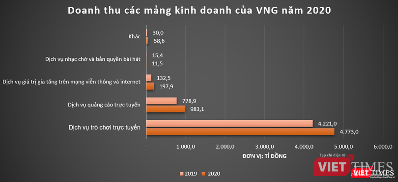 Trong đó, mảng dịch vụ trò chơi trực tuyến đóng góp tới 79,2% doanh thu cho VNG, với giá trị đạt 4.773 tỉ đồng. Tiếp đến là các lĩnh vực dịch vụ quảng cáo trực tuyến (983,1 tỉ đồng), dịch vụ giá trị gia tăng trên mạng viễn thông và internet (197,9 tỉ đồng), dịch vụ nhạc chờ và bản quyền bài hát (11,5 tỉ đồng).