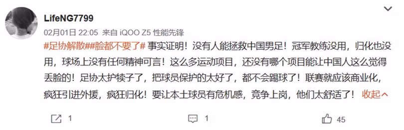 Một người dùng khác có nick là LifeNG7799 thẳng thắn chỉ ra rằng: “Sự thật đã chứng minh không ai có thể cứu được đội tuyển bóng đá nam Trung Quốc. Huấn luyện viên vô dụng, cầu thủ nhập tịch vô dụng, không thể hiện tinh thần thi đấu máu lửa trên sân. Với rất nhiều môn thể thao, không có môn nào có thể khiến người Trung Quốc cảm thấy xấu hổ như vậy. Hiệp hội bóng đá Trung Quốc đã quá o bế các CLB và cầu thủ đến nỗi họ không thèm chơi bóng nữa. Giải đấu đã bị thương mại hóa và nhập tịch cầu thủ điên cuồng khiến cầu thủ bản địa cảm thấy khủng hoảng…”