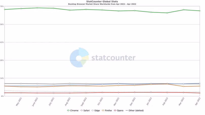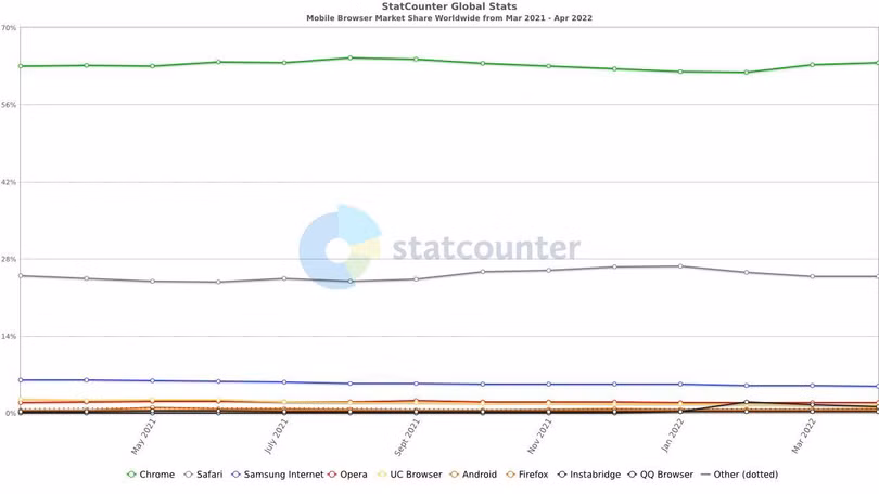 Tính tổng cả máy tính và thiết bị di động, Chrome dẫn đầu với 64,36%, Safari đứng thứ hai với 19,13% và Edge đứng thứ ba với 4,07% tổng thị phần. Xếp sau ba vị trí hàng đầu là Firefox, Samsung Internet và Opera với lần lượt là 3,41%, 2,84% và 2,07%.