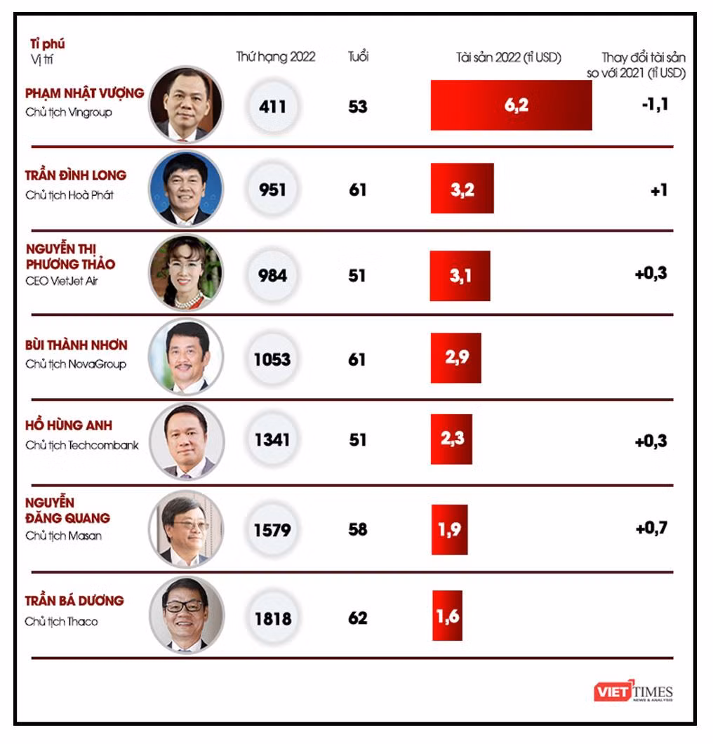 Đầu tháng 4 vừa rồi, Forbes cập nhật danh sách tỉ phú thế giới năm 2022. Việt Nam đóng góp 7 cái tên. Đó là Chủ tịch Vingroup Phạm Nhật Vượng, CEO VietJet Air Nguyễn Thị Phương Thảo, Chủ tịch Hòa Phát Trần Đình Long, Chủ tịch Techcombank Hồ Hùng Anh, Chủ tịch Thaco Trần Bá Dương, Chủ tịch Masan Nguyễn Đăng Quang và Chủ tịch Nova Group Bùi Thành Nhơn.
