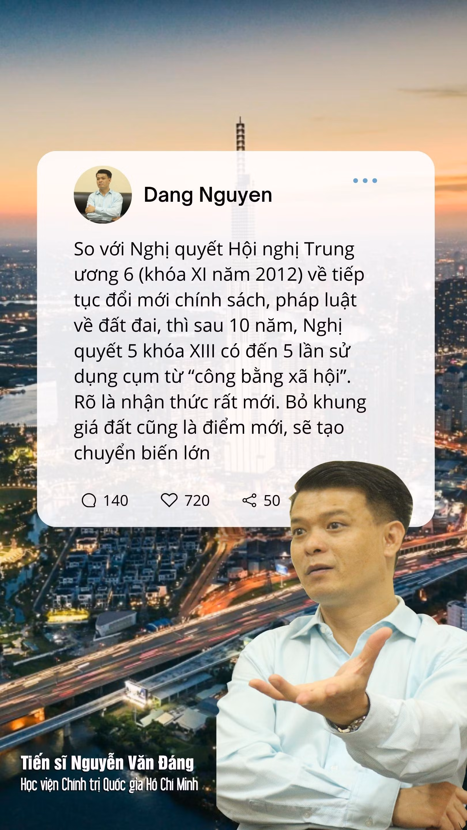 “So với Nghị quyết Hội nghị Trung ương 6 (khóa XI năm 2012) về tiếp tục đổi mới chính sách, pháp luật về đất đai, thì sau 10 năm, Nghị quyết Hội nghị Trung ương 5 khóa XIII này có đến 05 lần sử dụng cụm từ "công bằng xã hội". Rõ là nhận thức rất mới. Bỏ khung giá đất cũng là điểm mới, sẽ tạo chuyển biến lớn”, TS. Nguyễn Văn Đáng, nhà nghiên cứu Quản trị công và Chính sách, đã viết như vậy trên trang cá nhân ngay sau khi Trung ương ban hành Nghị quyết 18-NQ/TW về “Tiếp tục đổi mới, hoàn thiện thể chế, chính sách, nâng cao hiệu lực, hiệu quả quản lý và sử dụng đất, tạo động lực đưa nước ta trở thành nước phát triển có thu nhập cao” (viết tắt: Nghị quyết 18).