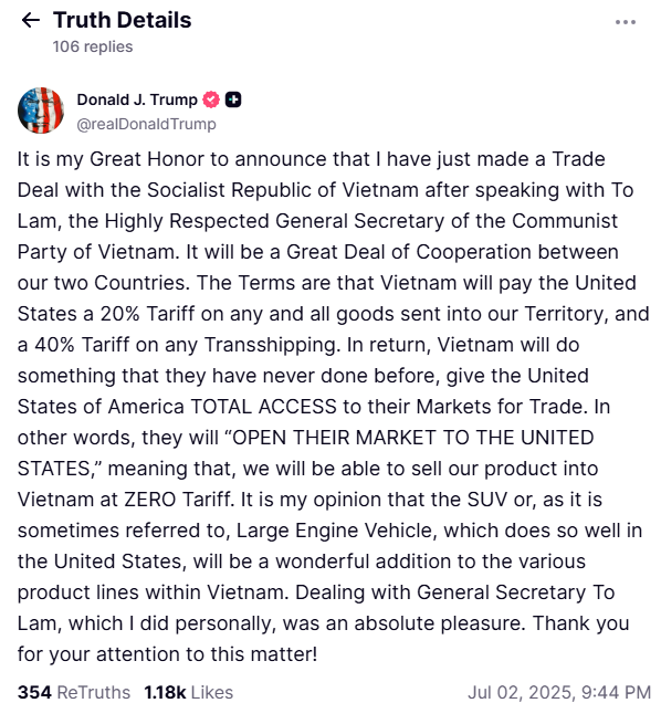 Ngay sau đó, vào lúc 10h25 sáng 2/7 (giờ địa phương), Tổng thống Mỹ Donald Trump đã đăng trên mạng xã hội Truth Social rằng ông vừa có một thỏa thuận thương mại với Việt Nam.