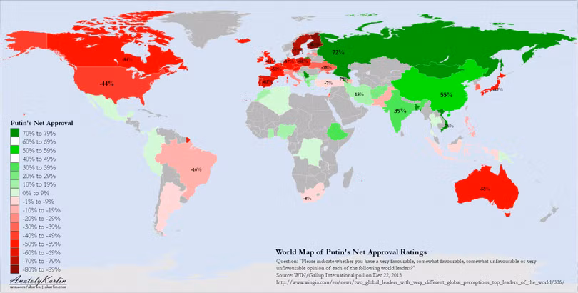 Phần lớn phần còn lại của thế giới ngoài phương Tây khá quan tâm về Putin (Mỹ Latinh, châu Phi) hoặc tiếp tục có thái độ tích cực về ông (Ấn Độ, Trung Quốc). Thực tế này một lần nữa minh chứng rằng ít nhất trên quan điểm dân số học toàn cầu, nói về việc “cô lập” Nga khỏi cộng đồng quốc tế có vẻ hoàn toàn vô nghĩa.