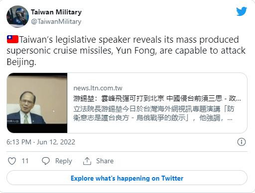 “Ông You Si Kun nói rằng lợi thế phòng thủ của Đài Loan là nhờ vào sự nguy hiểm tự nhiên của eo biển. Trung Quốc cần phải băng qua eo biển Đài Loan mới có thể tấn công Đài Loan, khác với đòn tấn công của Nga nhằm vào Ukraine…Nếu bạn muốn đổ bộ, bạn sẽ phải chiến đấu trên bờ biển. Nếu như việc đổ bộ thành công, mọi người ở Đài Loan lúc đó được xem là chết. Hãy ra ngoài đó và không bao giờ để Trung Quốc nuốt gọn Đài Loan…Tên lửa Yun Feng có thể tấn công Bắc Kinh, và Đài Loan có đủ khả năng tấn công Bắc Kinh. Trung Quốc cần suy nghĩ kỹ trước khi tấn công Đài Loan.”