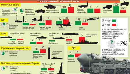 Bộ Quốc phòng Nga trong năm 2015 đã thông qua các biện pháp nhằm bảo đảm toàn diện cho quân đội Nga, nâng cao khả năng sẵn sàng chiến đấu của quân đội, cũng như cải thiện điều kiện xã hội dành cho quân nhân và gia đình họ. Có vị trí quan trọng là việc chuẩn bị kỷ niệm 70 năm Ngày Chiến thắng của nhân dân Liên Xô trong Chiến tranh Vệ quốc vĩ đại.