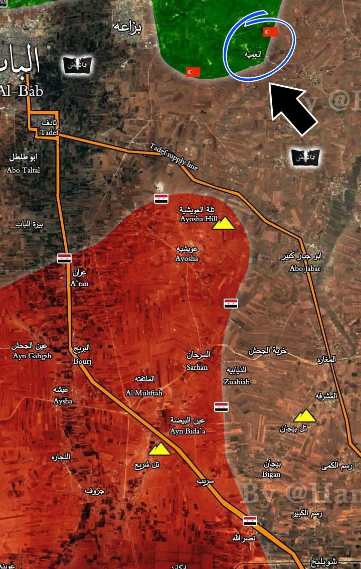 Lực lượng khủng bố IS trong thành phố al-Bab đang rơi vào tình huống rất khó khăn, hai hướng tấn công của quân đội Syria và liên minh quân sự do Thổ Nhĩ Kỳ dẫn đầu đang kẹp IS vào chảo lửa Al-Bab. Tình hình trở lên tồi tệ vượt sức chịu đựng do không quân của 3 nước, Nga, Syria và Thổ Nhĩ Kỳ đồng loạt dội bom vào chiến tuyến. Riêng không quân Thổ Nhĩ Kỳ, bất chấp nguy cơ thương vong dân thường, dội bom trực tiếp vào các khu phố dân cư.