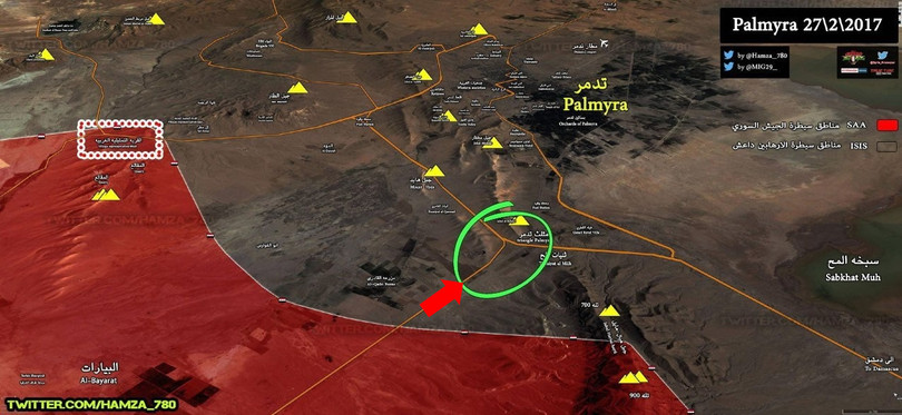 Sau nhiều cuộc tấn công mãnh liệt, quân đội Syria đã giành được ngã ba chiến lược Tam giác Palmyra. Được sự yểm trợ hiệu quả từ lực lượng không quân Nga, quân đội Syria triển khai một mũi nhọn tấn công, chọc thủng tuyến phòng thủ của IS trên hướng vành đai phòng ngự phía tây địa bàn trên sa mạc Syria.