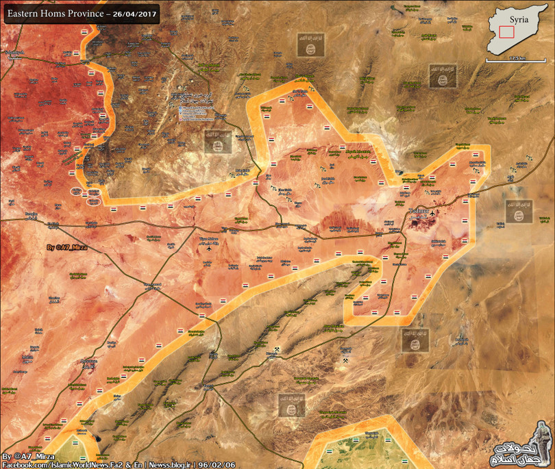 Al-Masdar News nhận được tin tức từ lực lượng quân sự phía đông bắc tỉnh Hom cho biết, quân đội Syria, phối hợp với lực lượng vũ tranh đia phương (NDF), thực hiện cuộc tấn công giải phóng khỏi ách chiếm đóng của IS khỏi các làng Tadmuriyah, Jibab Hamad, Rajm al-Qasr, Rajm Dergham , Rajm A'ali và Rajm Midraji. Các lực lượng vũ trang Syria cũng chiếm được đồi Al-A'alam và Trix.