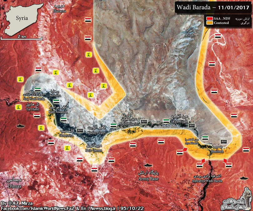 Quân đội Syria khẳng định, hiện nay không có thỏa thuận ngừng bắn ở Wadi Barada giữa chính quyền Syria và lực lượng Hồi giáo cực đoan, các chiến binh thuộc nhóm Jabhat Fateh Al-Sham và Harakat Ahrar al-Sham quyết liệt từ chối hạ vũ khí đầu hàng và giao nộp khu vực Wadi Barada để được vận chuyển an toàn đến tỉnh Idlib.