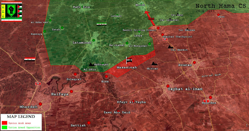 Sáng ngày 24.04.2017, quân đội Syria  tiếp tục cuộc tấn công quy mô lớn trên vùng nông thôn miền bắc Hama, đánh vào lực lượng chiến binh thánh chiến trong ngôi làng nhỏ Al-Massasneh gần thị trấn Morek.