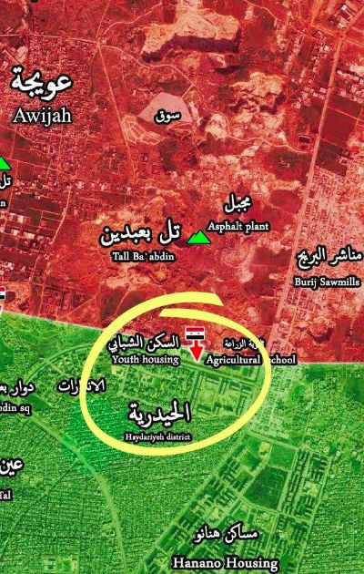 Đánh chiếm được khu Liên hợp Nhà Thanh niên Hanano, các lực lượng vũ trang Syria giành được quyền kiểm soát một số tòa nhà trong quận Al-Hidriyah, khi phát triến tấn công từ phía nam mỏ đá Bureij trên vùng đông bắc Aleppo.