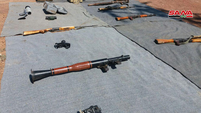 | Những vũ khí trang bị do lực lượng an ninh quân đội Syria thu giữ được ở Al-Quneitra. Ảnh minh họa SANA |