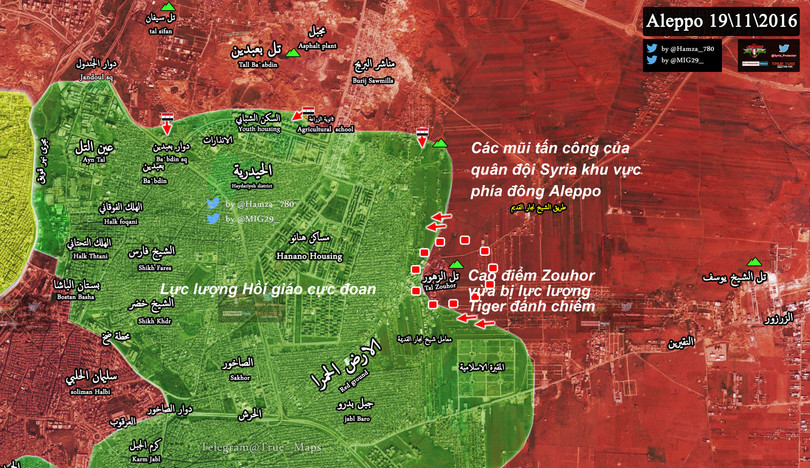 Bị áp lực từ cuộc tấn công của quân đội Syria và lực lượng Palestine, đánh vào quận Bustan al-Bashra sáng sớm ngày 19.11, các nhóm chiến binh Hồi giáo cực đoan trong vùng bị bao vây hoàn toàn bất ngờ khi lực lượng Tiger đánh vu hồi vào sườn phía đông khu vực phòng thủ, đánh chiếm ngọn đồi Zouhor và hàng chục tòa nhà liền kề.