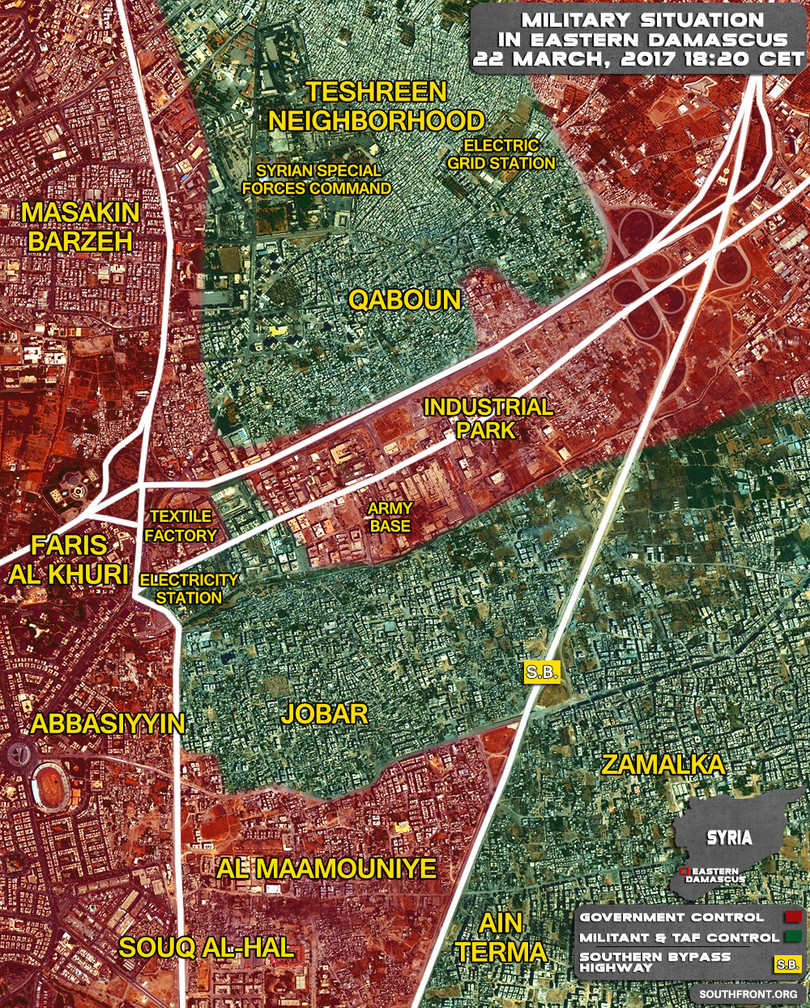 Trong ngày 22.03.2017, quân đội Syria đánh chiếm lại Nhà máy Vải sợi cùng một số tòa nhà, đầy lùi nhóm chiến binh về phía đông, giao chiến vẫn tiếp tục diến ra ác liệt. Theo tình hình chung, các nhóm chiến binh do Hay’at Tahrir Al-Sham dẫn đầu sẽ không từ bỏ ý đồ chọc thủng vòng vây của quân đội Syria cho đến khi quân đội Syria giành lại hoàn toàn quận Jobar.