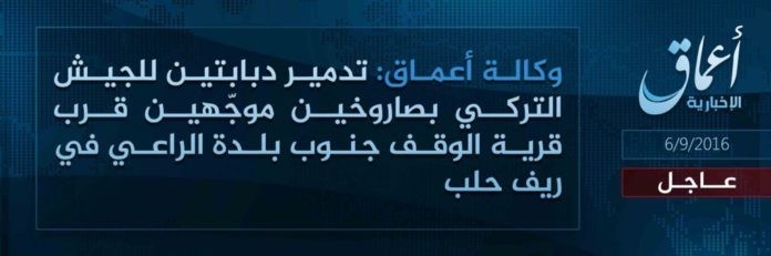 Theo các phương tiện truyền thông nhà nước Thổ Nhĩ Kỳ, hai binh sĩ đã thiệt mạng khi IS tấn công bằng tên lửa có điều khiển phá hủy 2 xe tăng quân đội Thổ Nhĩ Kỳ tại ngôi làng Al-Rai.