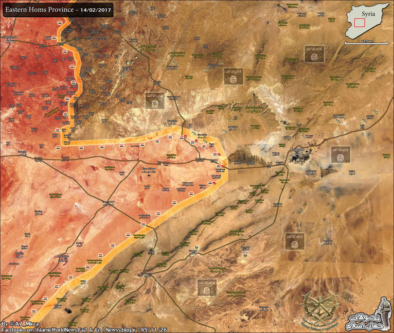 Trong ngày 16.02.2017, quân đội Syria tiếp tục cuộc tiến công vào các địa bàn do IS kiểm soát trên vùng sa mạc tỉnh Homs, đánh chiếm một vị trí chiến lược trên hướng tây khu mỏ khí gas Hayan.