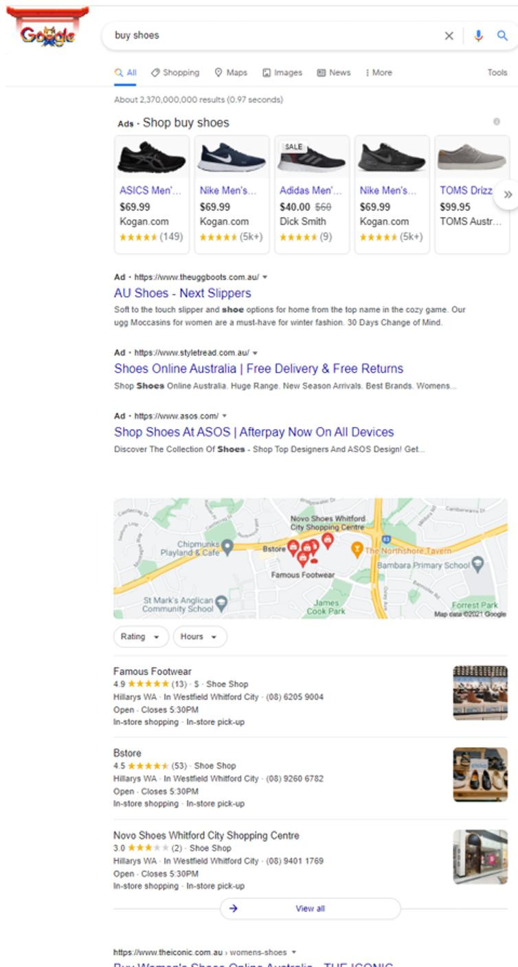 Trong ví dụ bên dưới, bạn sẽ phải cuộn chuột qua 3 quảng cáo dạng AdWords của Google (thuộc hệ thống quảng cáo của Google, trong đó, các nhà quảng cáo đặt giá thầu cho một số từ khóa nhất định để quảng cáo của họ xuất hiện trong kết quả tìm kiếm của Google hoặc các quảng cáo hiển thị) rồi mới đến kết quả tìm kiếm thực sự.