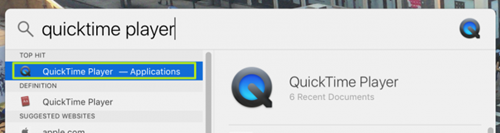 Đầu tiên, hãy nhấn tổ hợp phím Space + Command, sau đó nhập từ khóa quicktime player trong thanh tìm kiếm Spotlight và chọn QuickTime Player trong hộp thoại kết quả vừa xuất hiện.