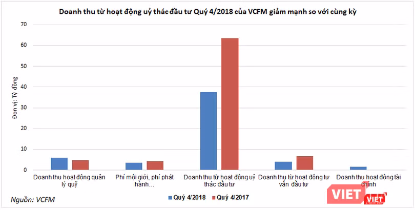 Trong đó, nguyên nhân chủ yếu là do số lượng và giá trị các hợp đồng ủy thác trong kỳ của các nhà đầu tư tổ chức, cá nhân giảm mạnh. Điều này khiến cho nguồn doanh thu từ hoạt động ủy thác đầu tư, vốn chiếm tỷ trọng lớn trong cơ cấu doanh thu của VCFM, chỉ đạt 37,5 tỷ đồng, giảm tới 41% so với Quý 4/2017.