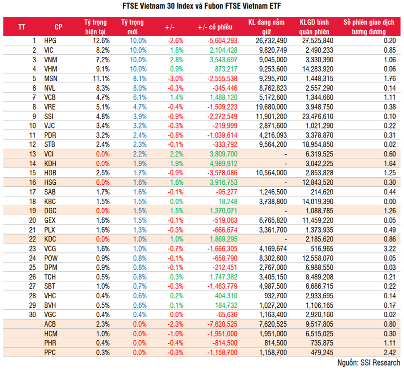 Mặc dù FTSE Russel không công bố danh mục chi tiết của chỉ số FTSE Vietnam 30 Index, song dựa trên số liệu chốt ngày 20/8, SSI dự báo các cổ phiếu như KDH, VCI, HSG, DGC và KDC có thể được thêm vào chỉ số nhờ đạt các điều kiện yêu cầu về vốn hóa và thanh khoản. Ngược lại, quỹ sẽ loại bỏ ACB, HCM do điều chỉnh giảm khối lượng mà nhà đầu tư nước ngoài có thể mua và PHR, PPC do không đủ điều kiện về vốn hóa.