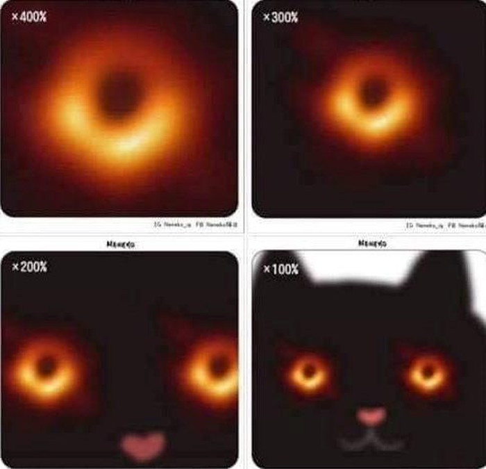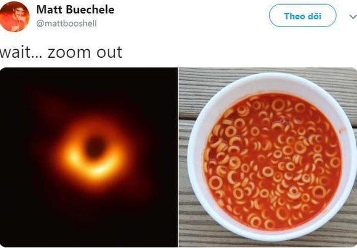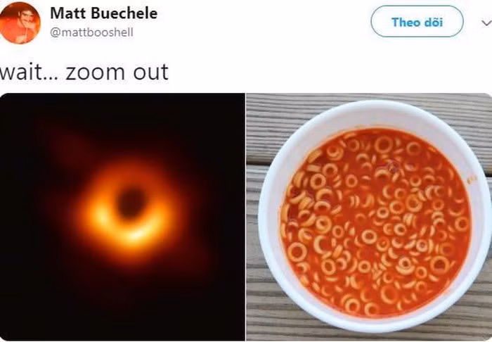 Phát hiện mang tính lịch sử cho thấy hố đen có đường kính 40 tỷ km, có khối lượng lớn hơn Mặt trời 6,5 tỷ lần và nằm cách hành tinh của chúng ta nhiều nghìn tỷ km. Sự kiện này được kỳ vọng sẽ mở ra trang mới cho nền khoa học vũ trụ trong tương lai. Bên cạnh góc nhìn học thuật, hình ảnh này nhanh chóng trở thành "mồi ngon" cho dân mạng thế giới "chế" thành nội dung hài hước. Ảnh: EHT.