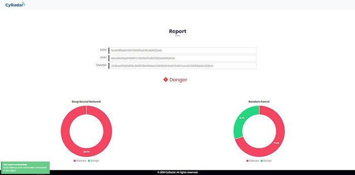 Công ty cổ phần an toàn thông tin CyRadar vừa công bố ra mắt hệ thống phân tích mối nguy hại sử dụng trí tuệ nhân tạo có tên CyRadar AI Engine tại sự kiện Ngày An toàn thông tin Việt Nam 2019 được tổ chức hôm nay, ngày 29/11 tại Hà Nội. Một số tính năng quan trọng của CyRadar AI Engine bắt đầu được mở tại địa chỉ https://scan.cyradar.com.