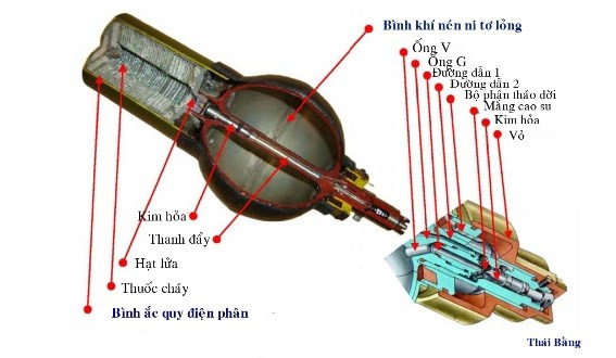 Trên ảnh là bộ phận nguồn năng lượng của tên lửa. Trong quả cầu hình tròn mầu đen là nito lỏng dưới áp suất 350 at, trong hộp hình trụ tròn là phẩn tử điện hóa, tương tự như bình ắc quy. Bình ắc quy này sử dụng một lần, hoạt động ở cơ chế nóng chảy (nhiệt điện). Khi bộ nguồn được kết nối với tên lửa, sử dụng lẫy đặc biệt chọc thủng màng bảo vệ, lượng ni tơ lỏng sẽ trào ra và theo đường ống dẫn riêng biệt chảy vào trong cảm biến hồng ngoại của tên lửa. Cảm biến sẽ bị làm lạnh đến – 200oC, thời gian cho ni tơ chảy vào đến bộ cảm biến là 4 đến 5 giây. Trong đầu tự dẫn của tên lửa có bộ phận lưu giữ chất ni tơ lỏng, vừa đủ cho 14 giây là khoảng thời gian tên lửa bay, sau 17 giây tên lửa sẽ tự hủy nếu không đánh trúng mục tiêu.