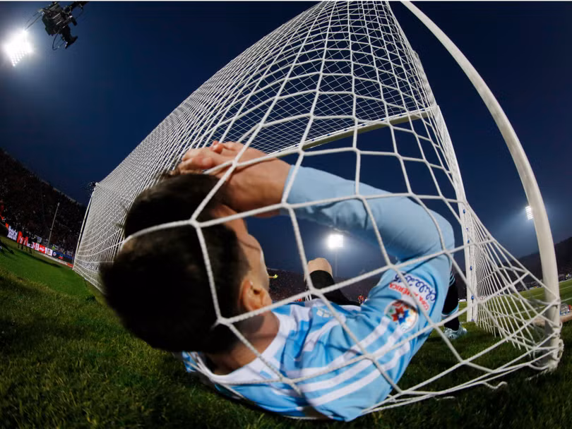 Siêu sao bóng đá Argentina Lionel Messi thất vọng ngã vào lưới sau khi đội bóng quốc gia của anh thua Chile trong trận chung kết Copa America 2015 tại Sân vận động Quốc gia, Santiago, Chile, ngày 4/7/2015.