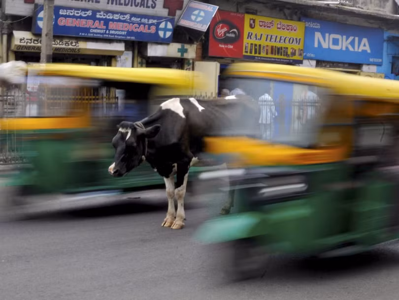 Chú bò đứng giữa những làn xe bận rộn trên phố tại Bengaluru, Ấn Độ, ngày 2/6/2015.