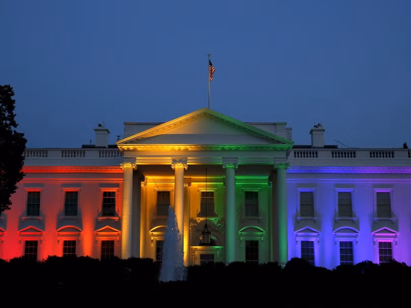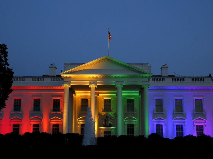 Nhà Trắng, Mỹ, được chiếu sáng bằng ánh sáng cầu vồng sau khi Tòa án Tối cao Mỹ đưa ra phán quyết hợp thức hóa hôn nhân đồng tính tại Washington ngày 26/6/2015.