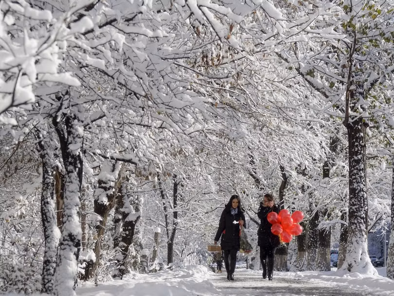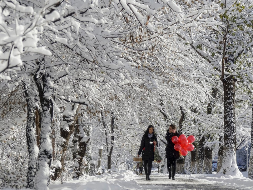 Hai phụ nữ đi bộ dọc theo một con đường phủ đầy tuyết ở Almaty, Kazakhstan ngày 16/11/2015.