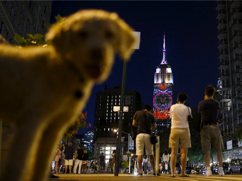 Một chú chó đứng trước đoàn người đang xem hình ảnh những loài có nguy cơ tuyệt chủng được chiếu trên tòa nhà Empire State, New York ngày 1/8/2015 nhằm nâng cao nhận thức của mọi người.