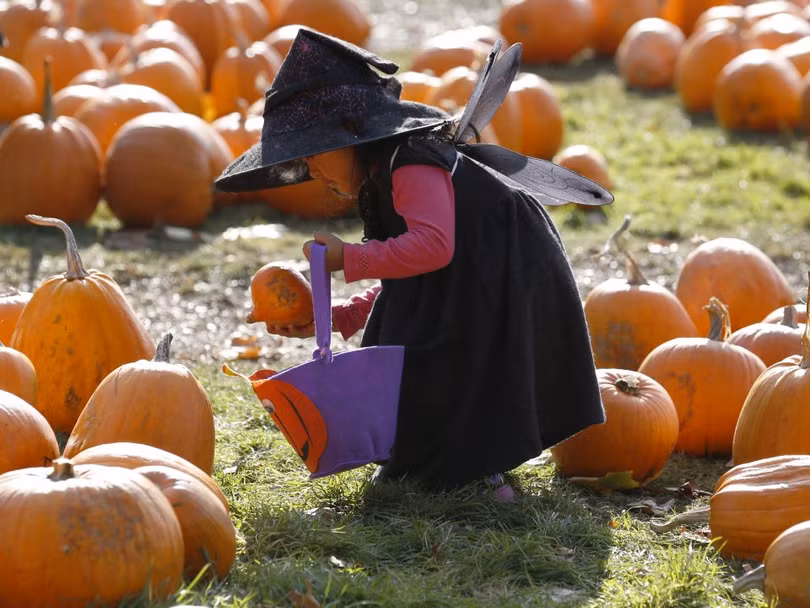 Cô bé Krizia Magdua mặc đồ phù thủy và chơi đùa giữa những quả bí ngô được chuẩn bị cho lễn hội Halloween tại Trang trại Crockford Bridge ở Addlestone gần Woking, miền nam nước Anh, 26/10/2015.