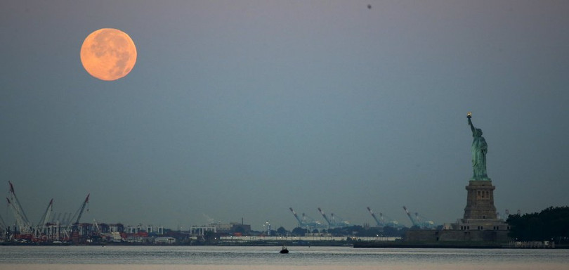 Mặt trăng xanh bên tượng Nữ thần tự do ở New York, 31/7/2015. Trăng xanh là lần trăng tròn thứ hai trong một tháng dương lịch.