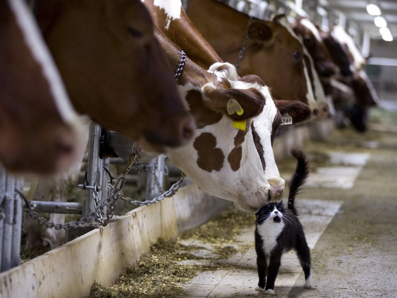 Những chú bò chơi với chú mèo trong lúc chờ vắt sữa tại một trang trại ở Granby, Quebec, 26/7/2015.
