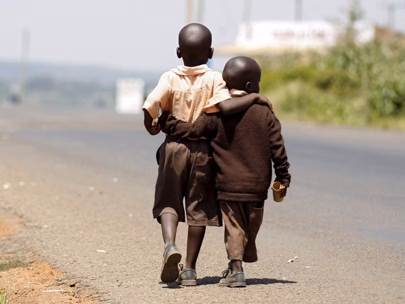 Hai cậu bé ở làng Kogelo, phía tây thủ đô Nairobi, Kenya, đi bộ từ trường về nhà để ăn trưa vào ngày 16/7/2015.