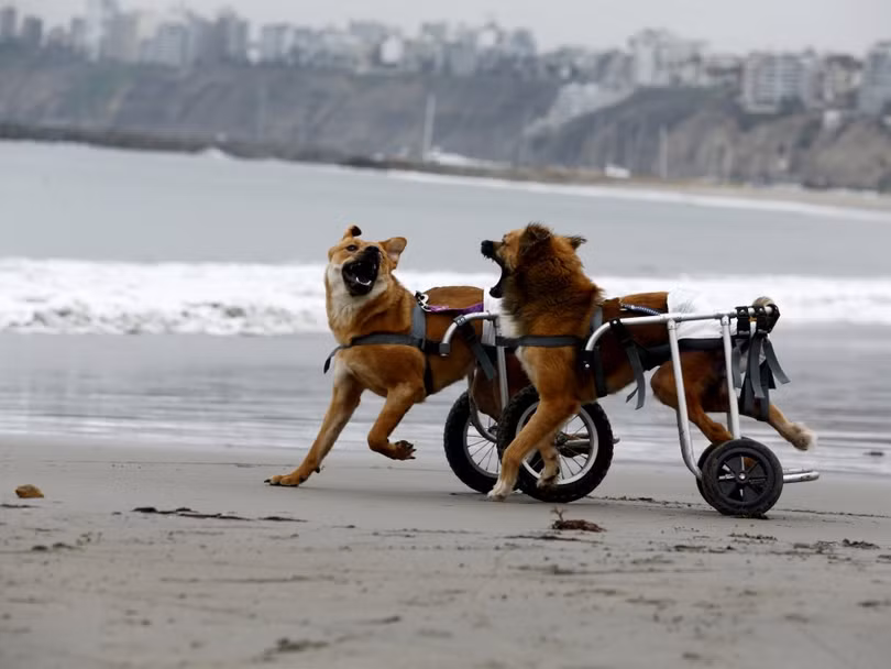 Pelusa và Huellas, hai chú chó bị liệt và phải dùng xe lăn đang chơi với nhau trên bãi biển Pescadores, Chorrillos, Lima, 7/9/2015.