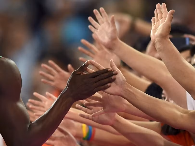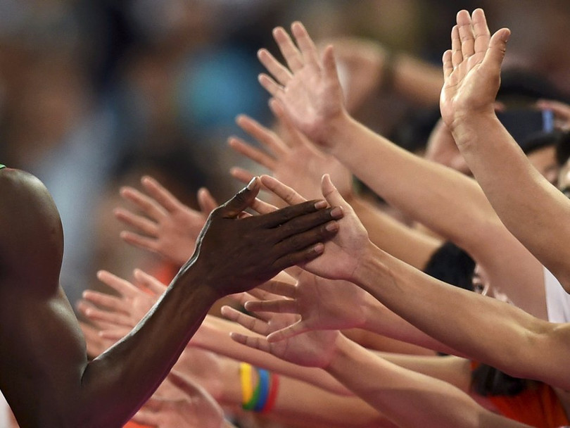 Vận động viên điền kinh Jamaica, Usain Bolt, đập tay với fan hâm mộ sau khi dành huy chương vàng nội dung chạy 200 mét tại IAAF World Championship lần thứ 15 diễn ra ở Sân vận động Quốc gia, Bắc Kinh, Trung Quốc vào ngày 27/8/2015.