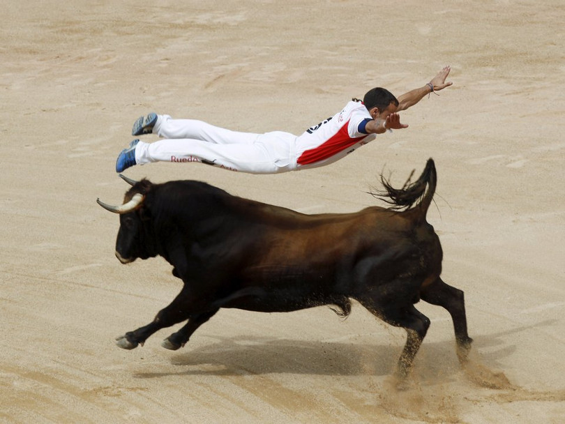 Một "recortador" nhảy qua lưng một con bò tót trong cuộc thi tại trường đấu bò Pamplona trong ngày thứ sáu của lễ hội San Fermin, phía bắc Tây Ban Nha, ngày 11/7/2015. Khác với các đấu sĩ, "recortador" chỉ né tránh con bò và không sử dụng mũi lao hay gươm.