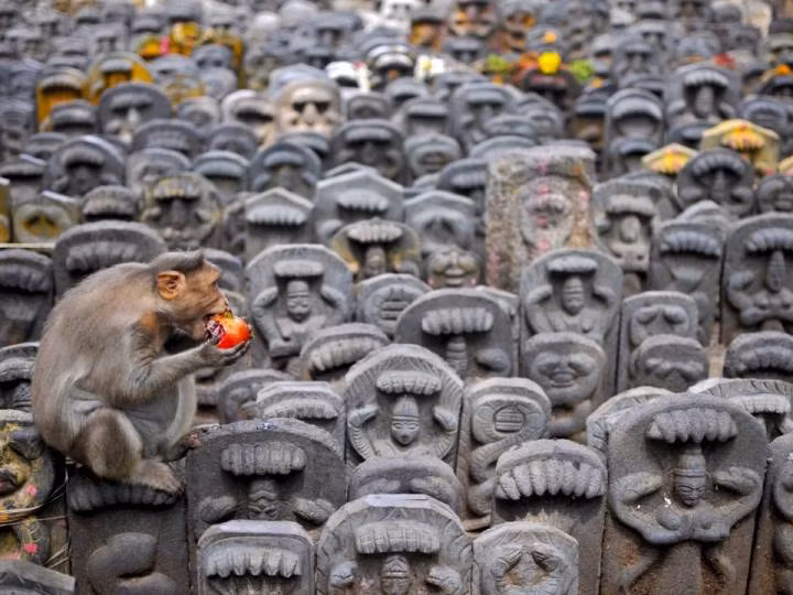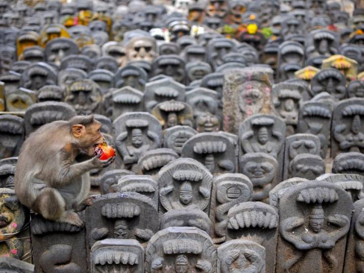 Một chú khỉ ngồi trên tấm bia thần rắn khi đang ăn quả lựu do các tín đồ bỏ lại sau lễ hội Nag Panchami ở một ngôi chùa vùng ngoại ô thành phố Bengaluru, Ấn Độ ngày 19/8/2015.