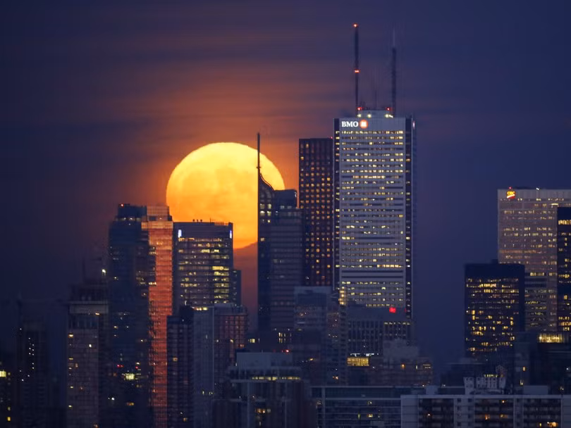 Trăng mọc đằng sau những tòa nhà cao tầng tại khu tài chính ở Toronto, 25/11/2015.