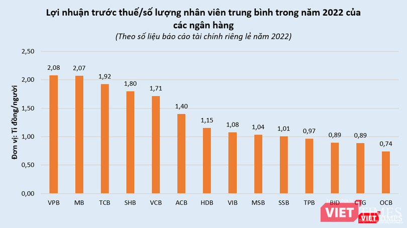 Ở nhóm "Big 4" ngân hàng quốc doanh, tính đến cuối năm ngoái, tỷ lệ tài sản/nhân viên của Vietcombank là 82,7 tỉ đồng/người, BIDV là 80,8 tỉ đồng/người, VietinBank là 78,4 tỉ đồng/người và Agribank là 47,3 tỉ đồng/người.