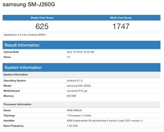 Theo Android Authority, thiết bị vừa xuất hiện trên Geekbench với tên mà SM-J260G, nhiều khả năng ra mắt với tên gọi Galaxy J2 Core.