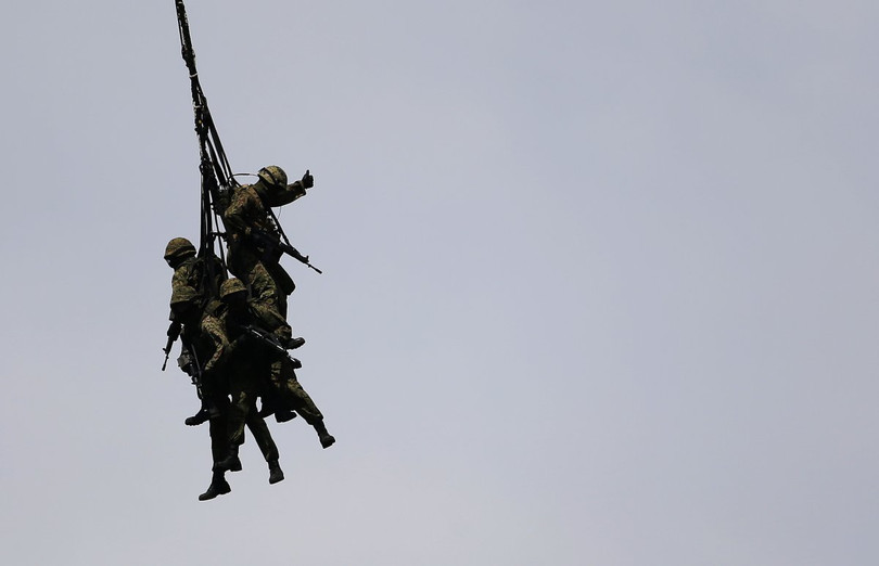 Các quân nhân thuộc lực lượng Phòng vệ lục quân Nhật Bản đổ bộ bằng dây từ máy bay trực thăng vận tải.